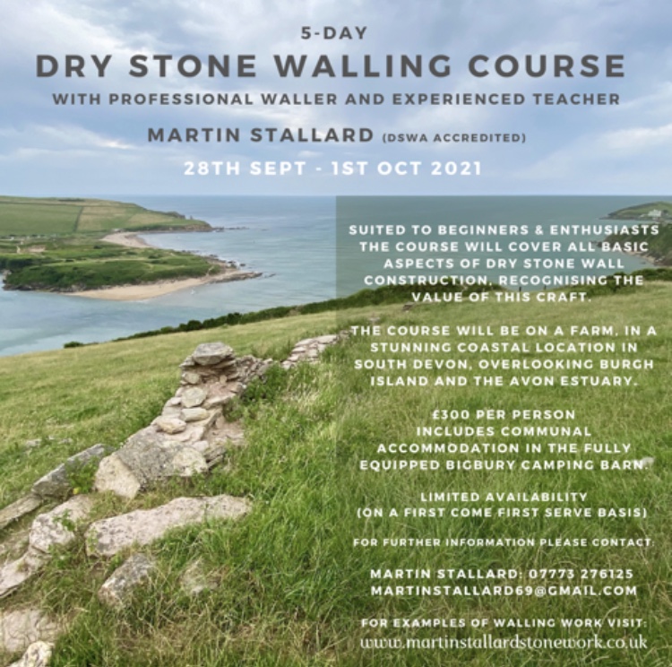 Beginners dry stone walling course. Location to be confirmed, though likely to be near Spyway, Langton Matravers, Dorset. For further details and to apply, see Courses